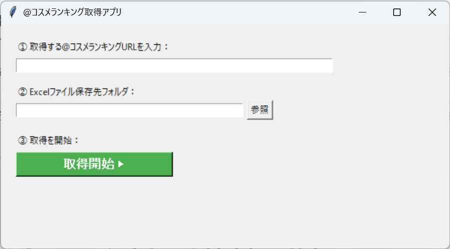 「URLを入れてボタンを押すだけ」で、ランキング情報をExcelに「@cosme」のランキングページから商品情報を自動取得し、Excelファイルに出力するWindowsアプリです。